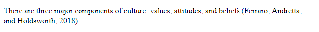 There are three major components of culture: values, attitudes, and beliefs (Ferraro, Andretta, and Holdsworth, 2018).